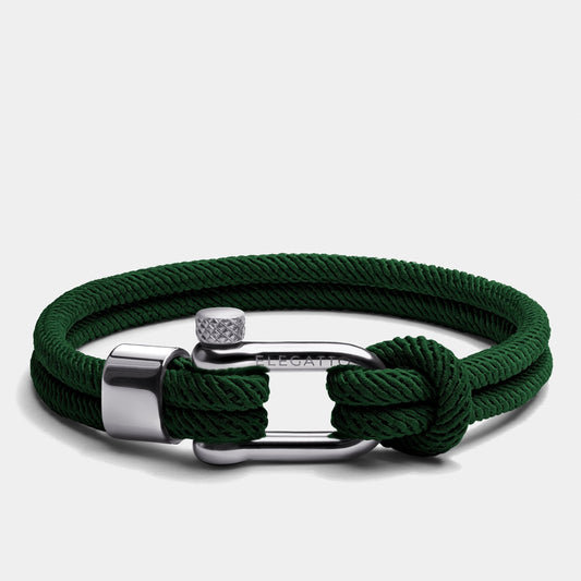The Alchor Platinum Forest Green Bracelet features a polished stainless steel clasp and durable rope...