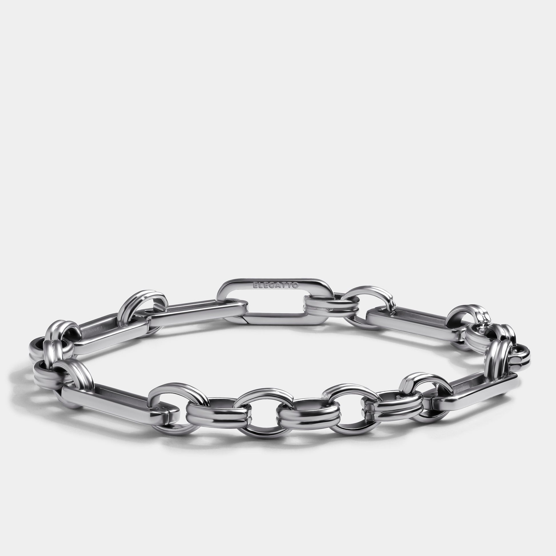 Crafted from Silver plated stainless steel, our Catena Bracelet keeps things casual making it an easy addition to your wrist on its own or as a stack. Features rectangular links and a discrete hinge lobster clasp designed right into one of the links. This unique hinge clasp allows for easy application and a seamless look. This timeless chain bracelet is the perfect addition to your collection that will definitely elevate your style and make you stand out.
