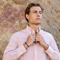 This is minimalist men's leather jewelry at its finest. The double brown braided leather strands secured by high-shine gold crimps. Looks impressive alone or layered with any of our cuff bracelets.