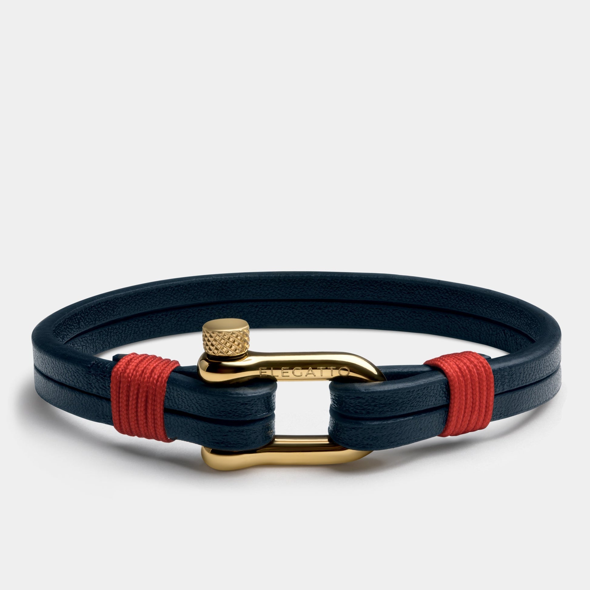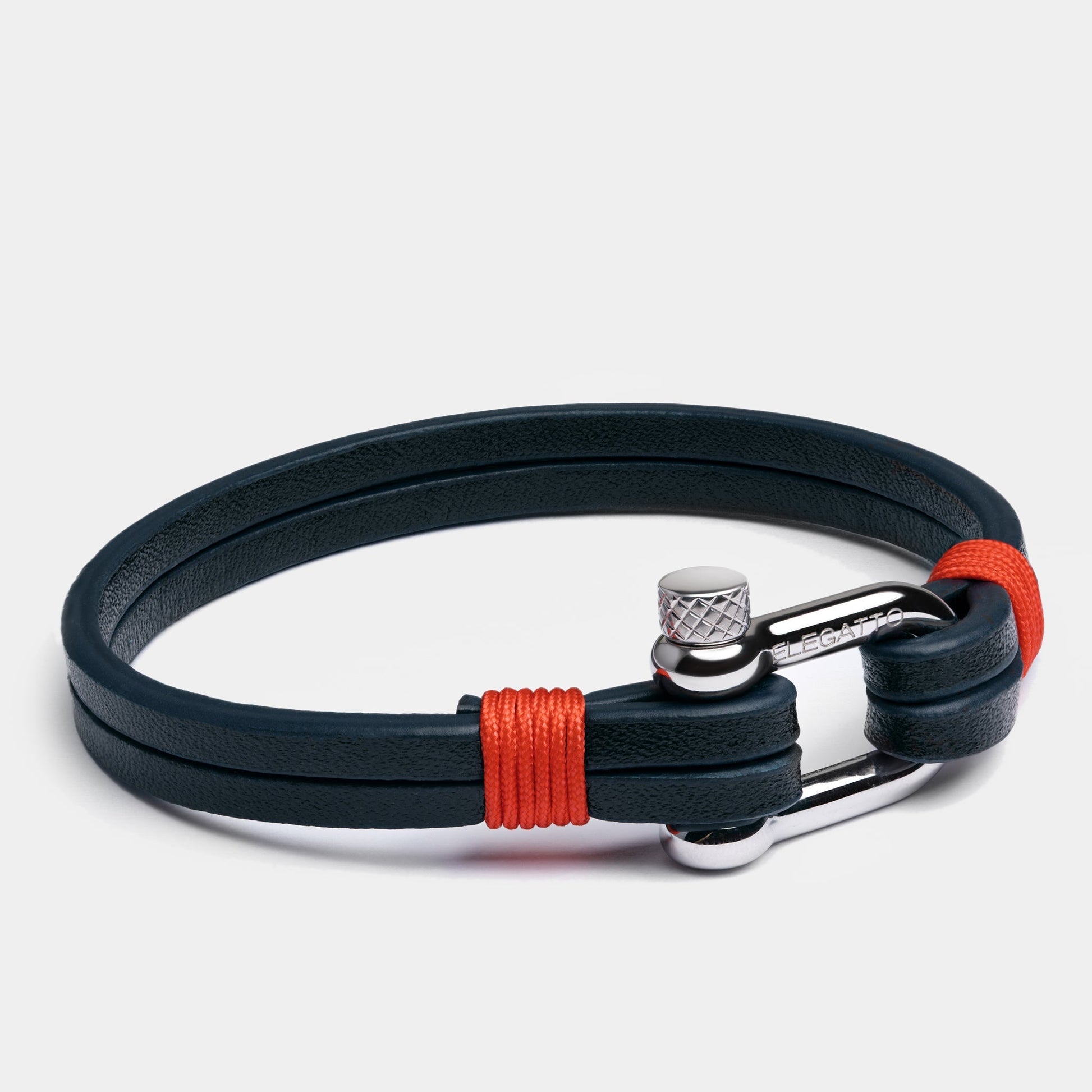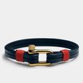 This refined masculine bracelet is an ideal accessory for a formal and cultured look. The Kellmore Red inspires streamlined racing elegance, vibrantly highlighting the solid dark blue leather.