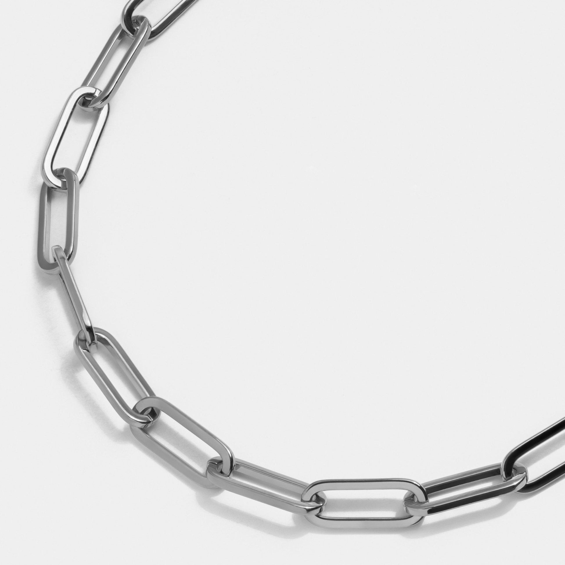 Crafted from silver plated stainless steel, our Paperclip Necklace Silver features rectangular links and a discrete hinge lobster clasp designed right into one of the links. This unique hinge clasp allows for easy application and a seamless look. Simple yet on trend, you can wear it on its own for the ultimate minimalist look or layered with other necklaces to create your own unique style.