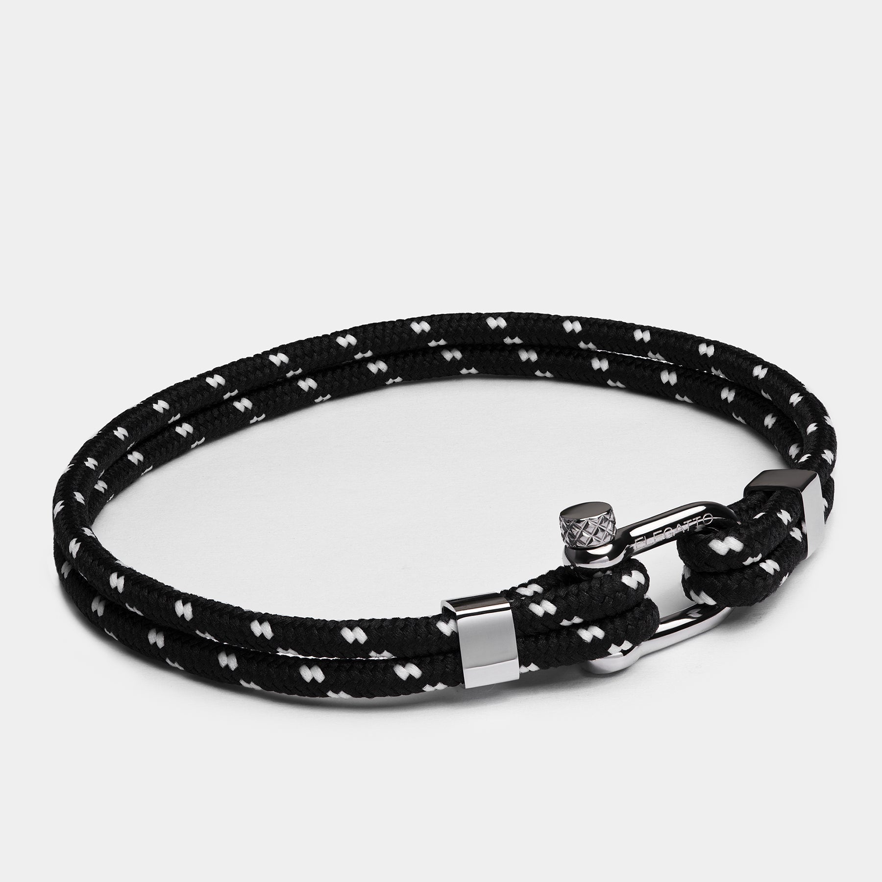 The Viva Black bracelet utilizes the thinnest size of our signature nautical-grade nylon cord, doubled and looped elegantly around the classic sterling plated, stainless steel shackle, with the same sterling plated stainless links highlighting the sleek closure. It is comfortable on the wrist and won't blacken or tarnish.